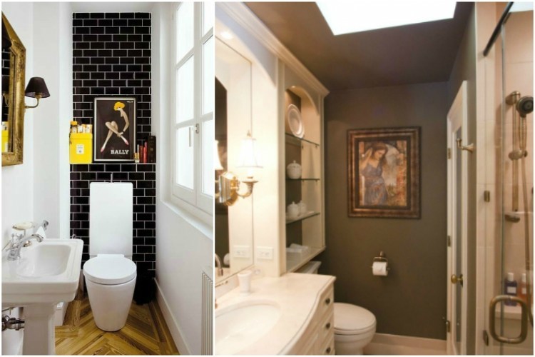 Continue to 11 of 21 below. Continue to 5 of 14 below. Harvey cedars bathroom renovation (2020) by joseph clymer. Arrange a series of prints or canvases vertically on a narrow angled wall. Glossy black tiles with contrasting grout make the space refined, and brass touches add chic. While yellow can be a bit, uh, overpowering when used in excess, a small bathroom is the perfect place to add a punch of color. But if you stick with teals that are close to the aqua family, you'll find them rather versatile. A translucent shower curtain surrounds the freestanding white bathtub creating a functional shower. Vertical presentation can also draw the eye upward, creating a sensation of spaciousness within tight quarters. (put a pin in this one, renters!) create a composition of cohesive prints on your bathroom wall and fashion some faux frames with strips of tape. The floating vanity, white half wall and white tile shower add light elements to balance the room. Split between to shades to make the illusion of space. Construct cubbies out of wood and hang it for your bathroom wall decor.